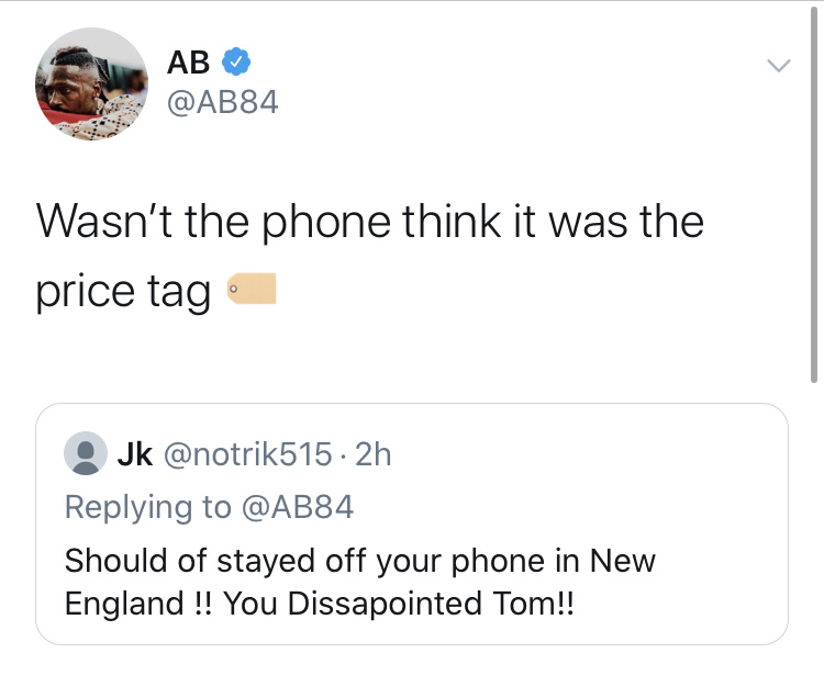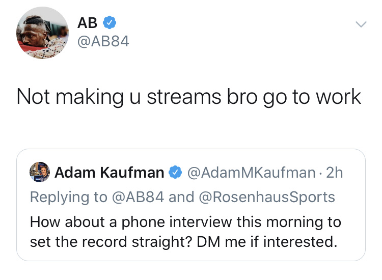 The AB circus continues to carousel. Hopefully you didn’t have tweet notifications on AB to see if he’s signing to get him on your fantasy team cuz he might have fired off 1,000 tweets this morning. Here are some highlights.