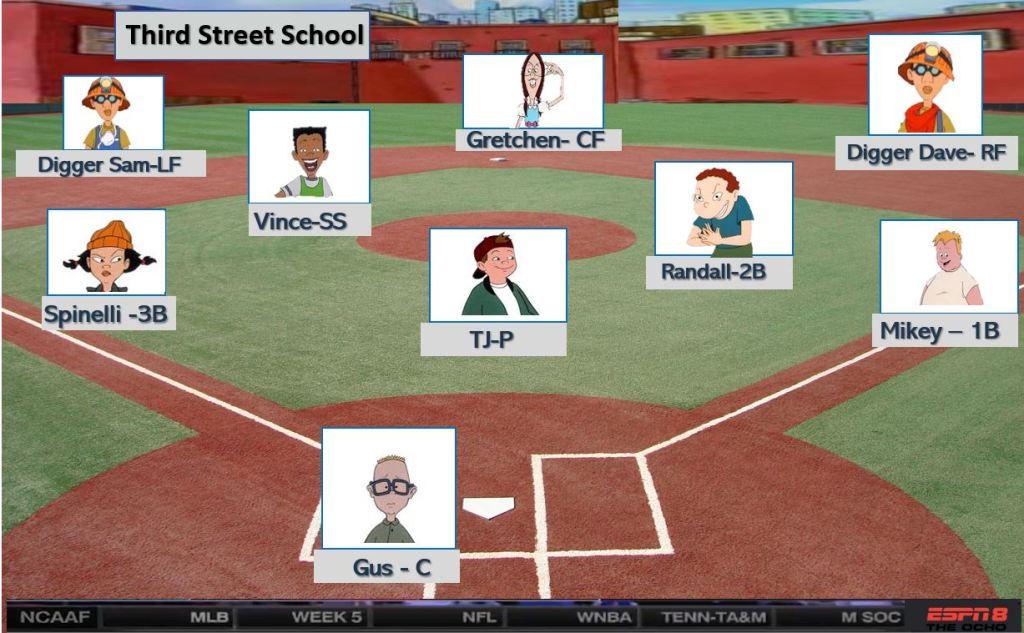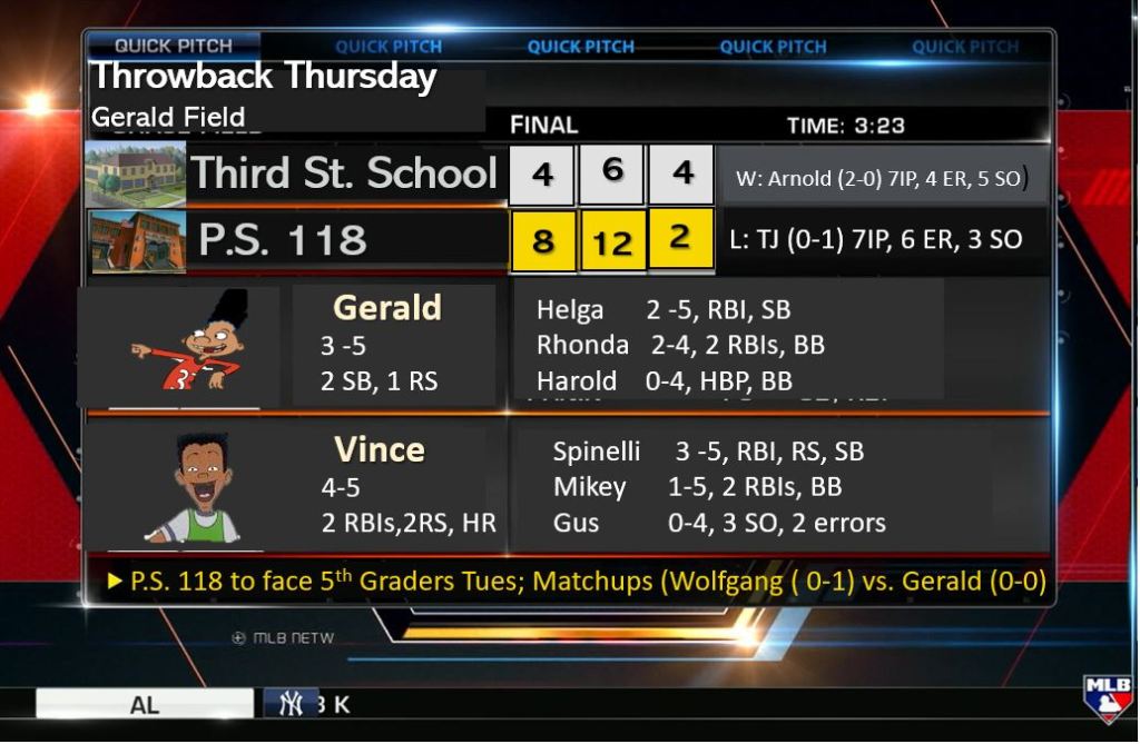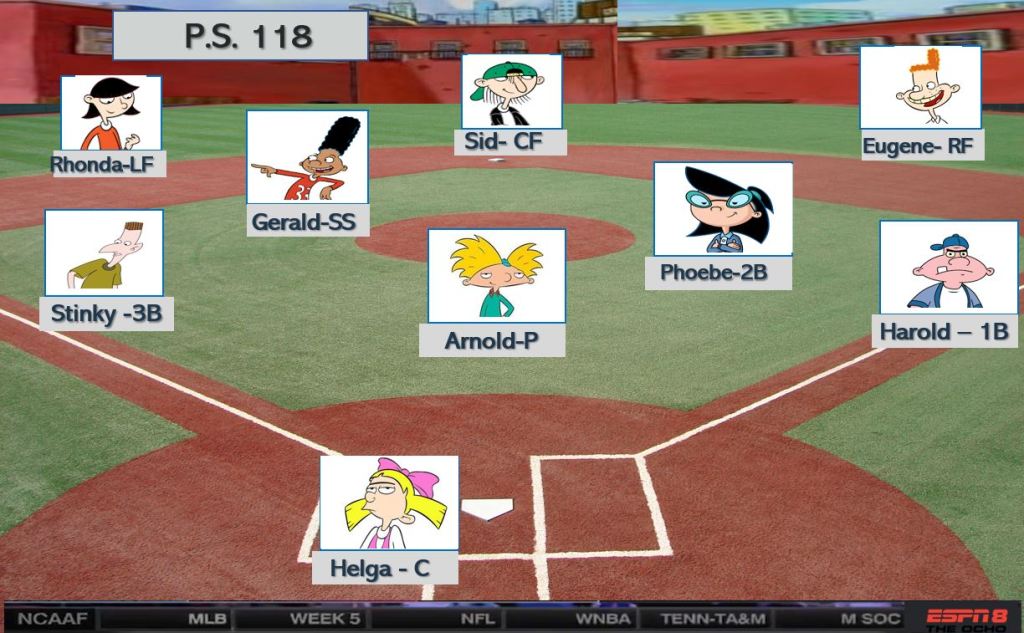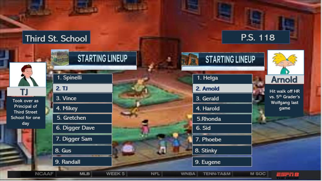 Third Street School opened to an early lead in the second inning as Vince hit a two-run shot into the left field street scoring Spinelli as well. TJ Detweiler held P.S. 118 scoreless for a few innings until a Rhonda double drove in Arnold and Gerald to tie the game at two after three innings. P.S. 118 starts to take some damage as the bottom of the order makes some noise with Phoebe and Stinky singling and being driven in by Helga and Arnold. 4-2 after 4. Third street cannot get anything going for the bottom of the order but a deep Mikey single drives in TJ and Vince to tie at 4-4. However, P.S. 118 is just too much for Third Street as a hitting spree and some untimely Randall and Gus errors give P.S. 118 an 8-4 victory. Post-game cele at Arnold’s NYC rooftop bedroom with plenty of Yahoo soda. Add another W to Arnold’s HOF childhood.