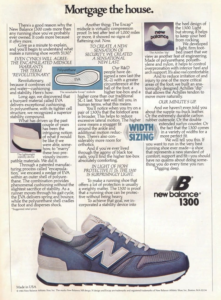“Mortgage the house,” is what New Balance told the consumer when they dropped the NB 1300 in 1985 for $130 ($282 today with inflation). By marketing the shoe as a luxury item, calling it “the very best running shoe ever made,” the shoe became a cult hit in the land where flexing high end goods is practically a sport: JAPAN.