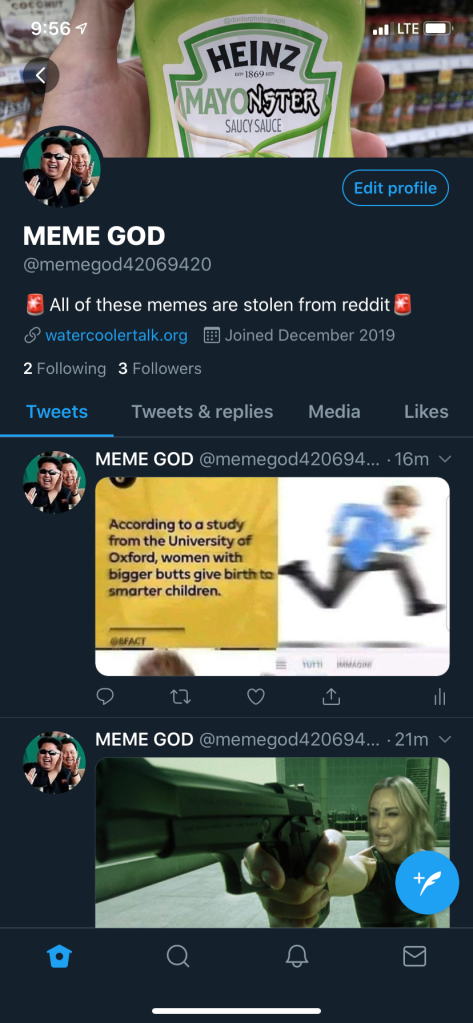 Think of me as a meme curator, vetting through all the not dank shit to get your that GOOD spice, and even throwing my own shit on top of it. Give it a follow, I promise you won’t regret it.
